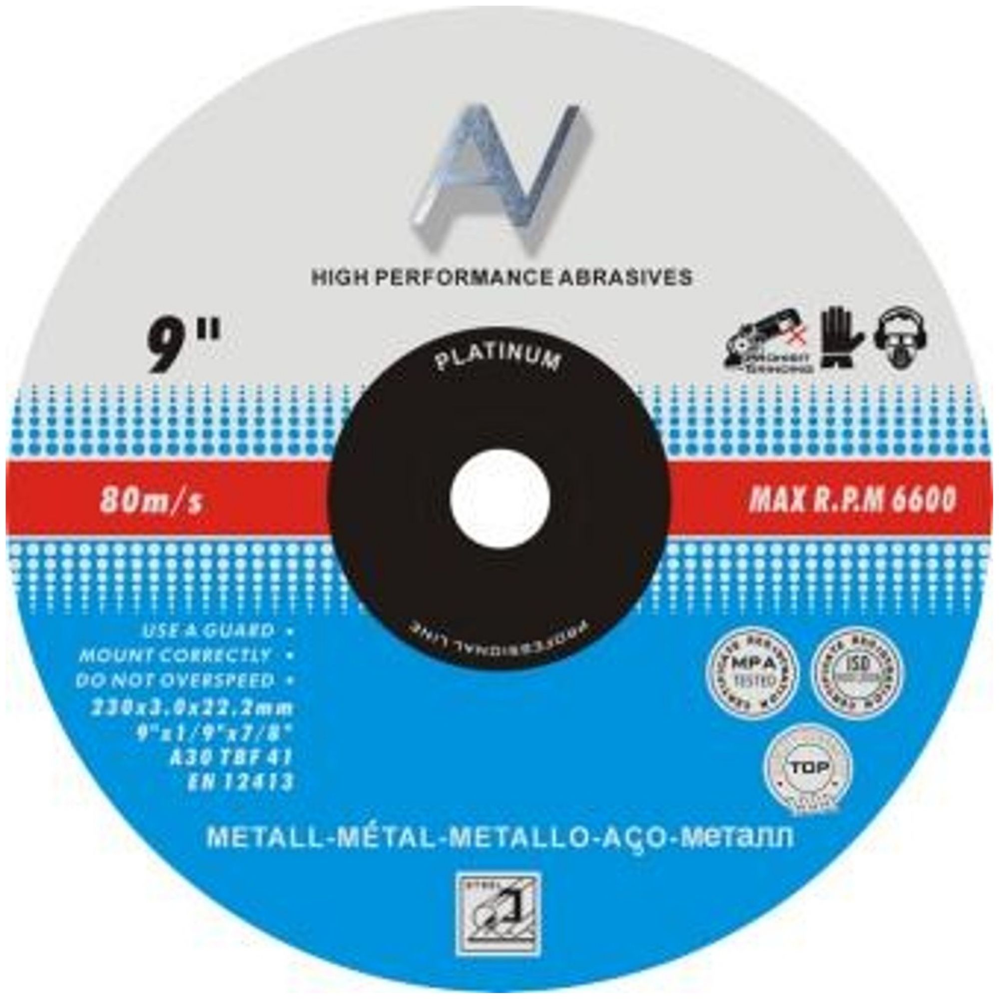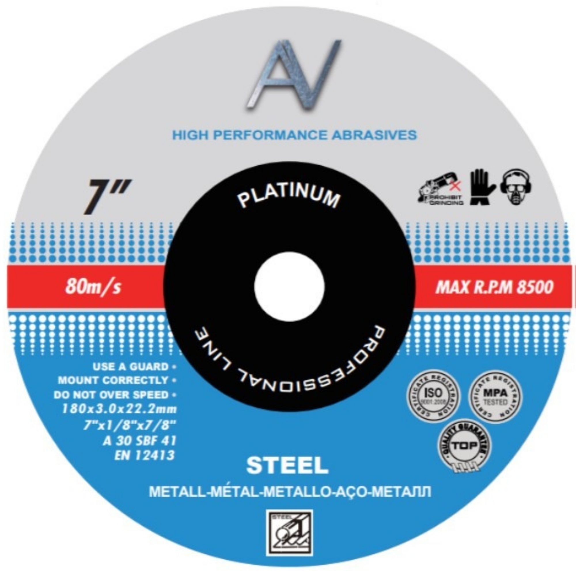 Disco de alta calidad marca AV ideal para cortes limpios en aceros al carbón. Para uso en esmeriles angulares.